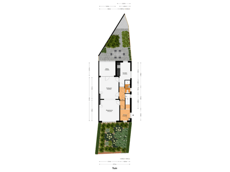 Vanuit de serre en keuken is de tuin op het zuidwesten te bereiken, die de vorm van een driehoek heeft. Er is een poort naar de openbare weg, er staat een houten schutting en er is genoeg plek om lekker buiten te zitten.