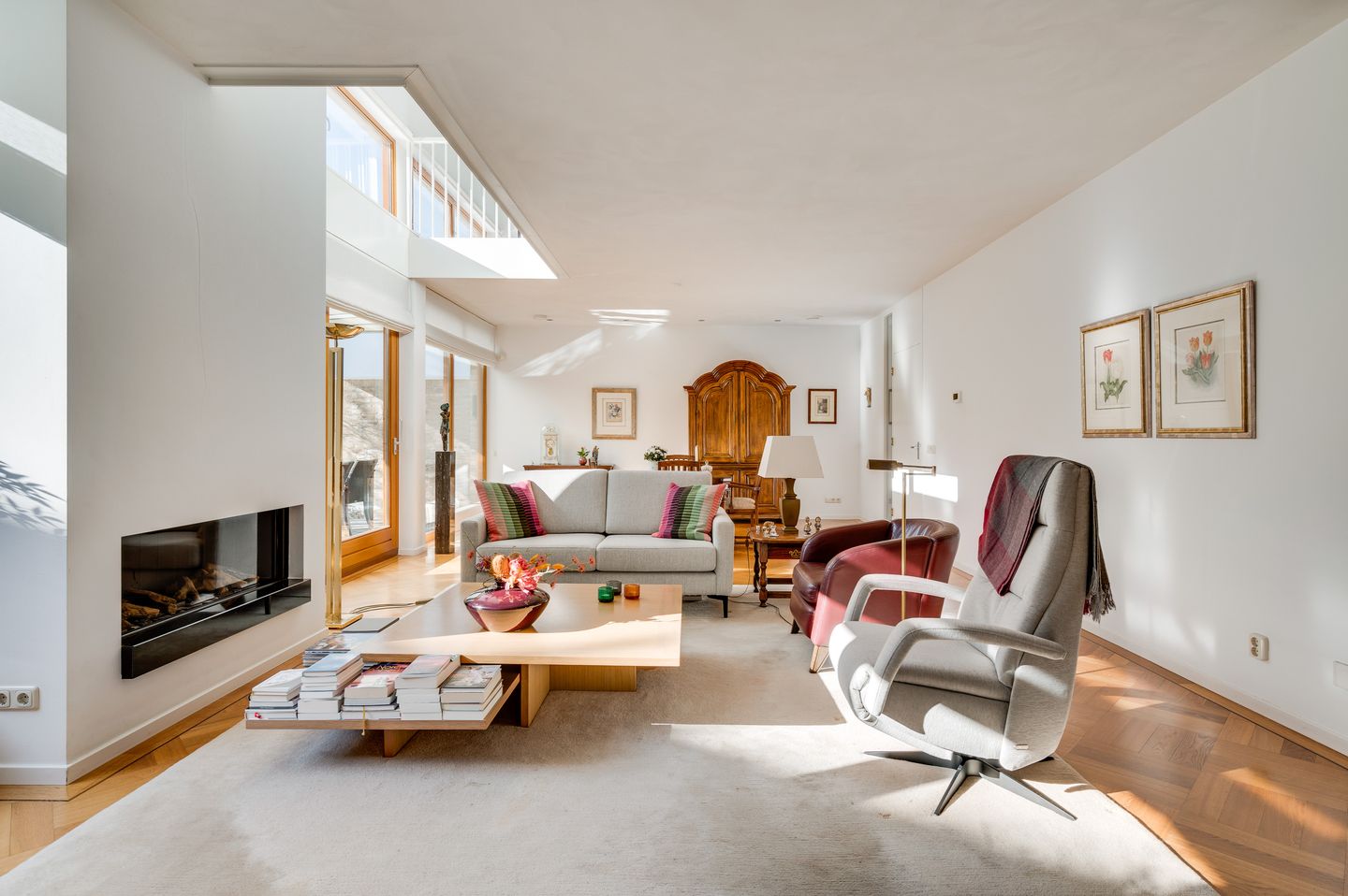 Imposante living 1041 x 508 cm met eikenhouten vloerdelen, grote raampartijen, openslaande deuren en schuifpui naar de tuin, sfeervolle gashaard en speels contact met de eerste verdieping via een vide.