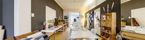 Aan het einde van de hal, aan de linkerzijde, is de toiletruimte met fonteintje. Op de begane grond is een grote, multifunctionele ruimte voorzien van een baliemeubel met ingebouwde vaatwasser die de thuisbasis van uw bedrijf kan worden. Met een totale oppervlakte van circa 45 m2 is dit een fantastische werkruimte, met een 3.65 meter hoog plafond en veel lichtinval door de grote ramen aan de voor- en achterzijde. Fraaie elementen zijn de parketvloer, stijlplafonds en de schuifdeuren met glas in loodramen.