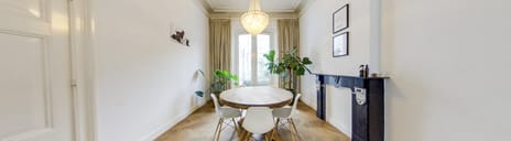 Rechts in de hal is een deur naar de woonkamer (circa 9,31 x 3,66) boordevol charme, karakter en sfeer. Het zitgedeelte is aan de voorzijde, met uitzicht naar de rustige straat, en het eetgedeelte nodigt uit voor een diner met vrienden of familie. Hoge, openslaande deuren geven toegang tot de tuin en de prachtige plafonds, visgraat parketvloer, klassieke schouw en moderne gashaard met maatwerk tv-meubel mogen niet onvermeld blijven.