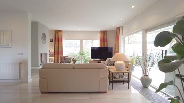 De lichte woonkamer met aansluitend de eetkamer en open keuken is afgewerkt met een marmeren tegelvloer, stucwerk als wandafwerking en een stucwerk gipsplatenplafond met spotverlichting. De royale raampartijen zorgen voor veel daglichttoetreding. De woonkamer is voorzien van gashaard en geeft toegang tot de sfeervolle overkapping en middels de eetkamer toegang tot de tussenhal en via een openslaande deur naar de achtertuin.