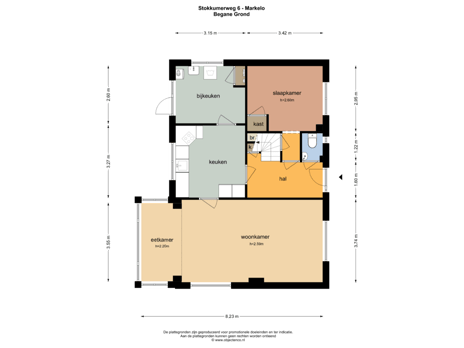 Begane grond: entree/hal met toilet, trapopgang, slaapkamer, woonkamer, eetkamer met erker, keuken, bijkeuken met wasmachine aansluiting, garage/schuur met bergzolder
