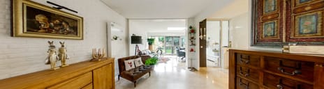 De ruim 8 meter lange woonkamer is aan de achterzijde uitgebouwd met een grote, lichte serre. Het resultaat is een leefruimte van circa 50 m2, met een gashaard bij het zitgedeelte en een stijlvolle wandafwerking. In de serre, waar laminaat op de vloer ligt, zorgen grote ramen en een lichtkoepel voor veel lichtinval.