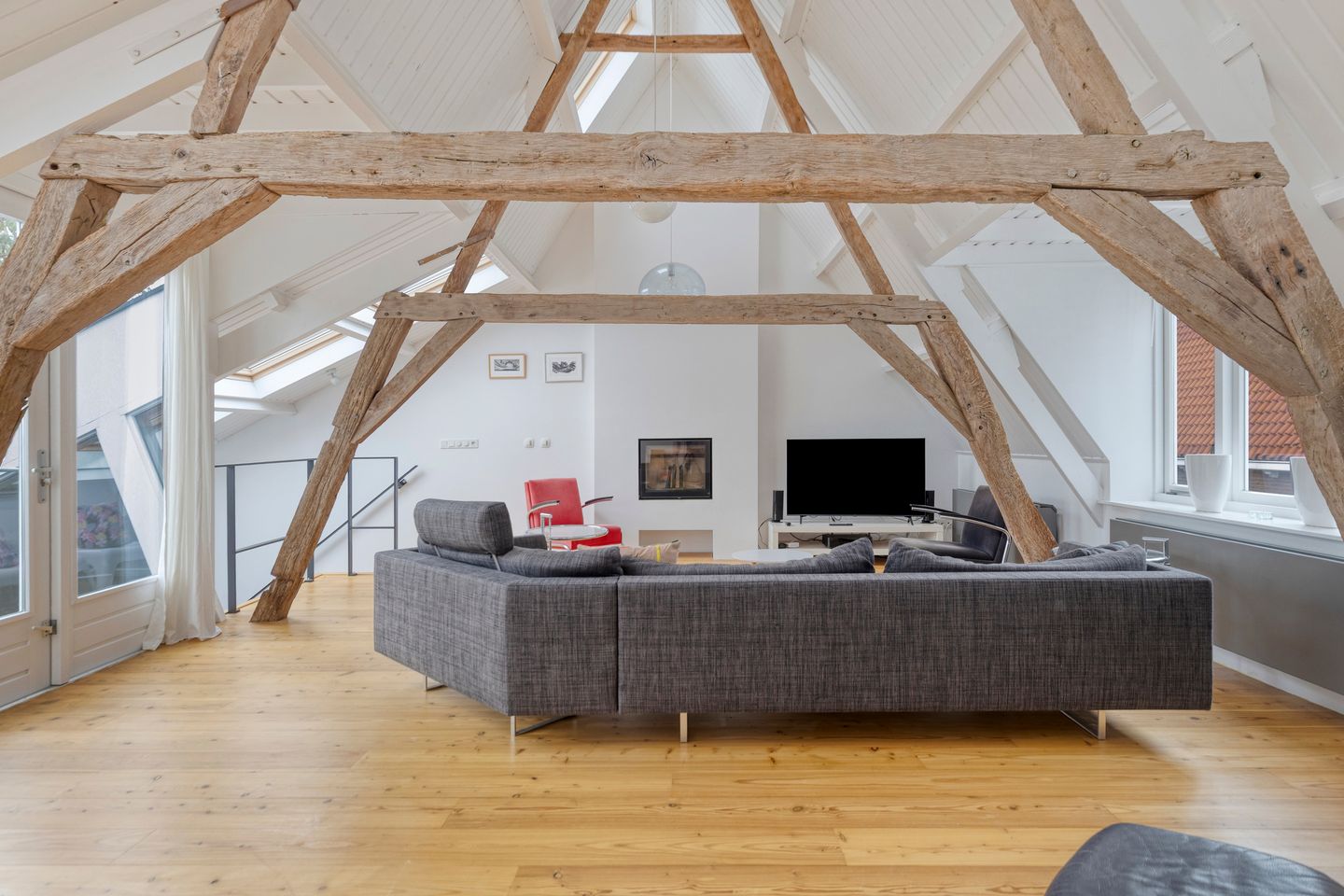 - Tweede verdieping: Fraaie lichte open woonkamer met houtkachel, vide en balkon (op het zuidoosten). De oude eiken balken constructie van het oorspronkelijke pand is nog zichtbaar. Twee dakramen zijn elektrisch bedienbaar met schakelaars bovenaan de trap (bij regen sluiten de ramen vanzelf).