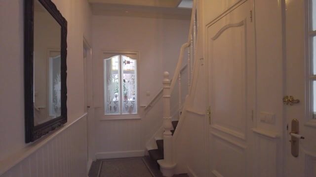 De entree brengt je in de hal met toegang tot de leefruimtes. De woonkamer is ruim, licht en sfeervol. Het balkenplafond en de authentieke details zorgen voor warmte en karakter, terwijl de grote ramen zorgen voor veel daglicht.