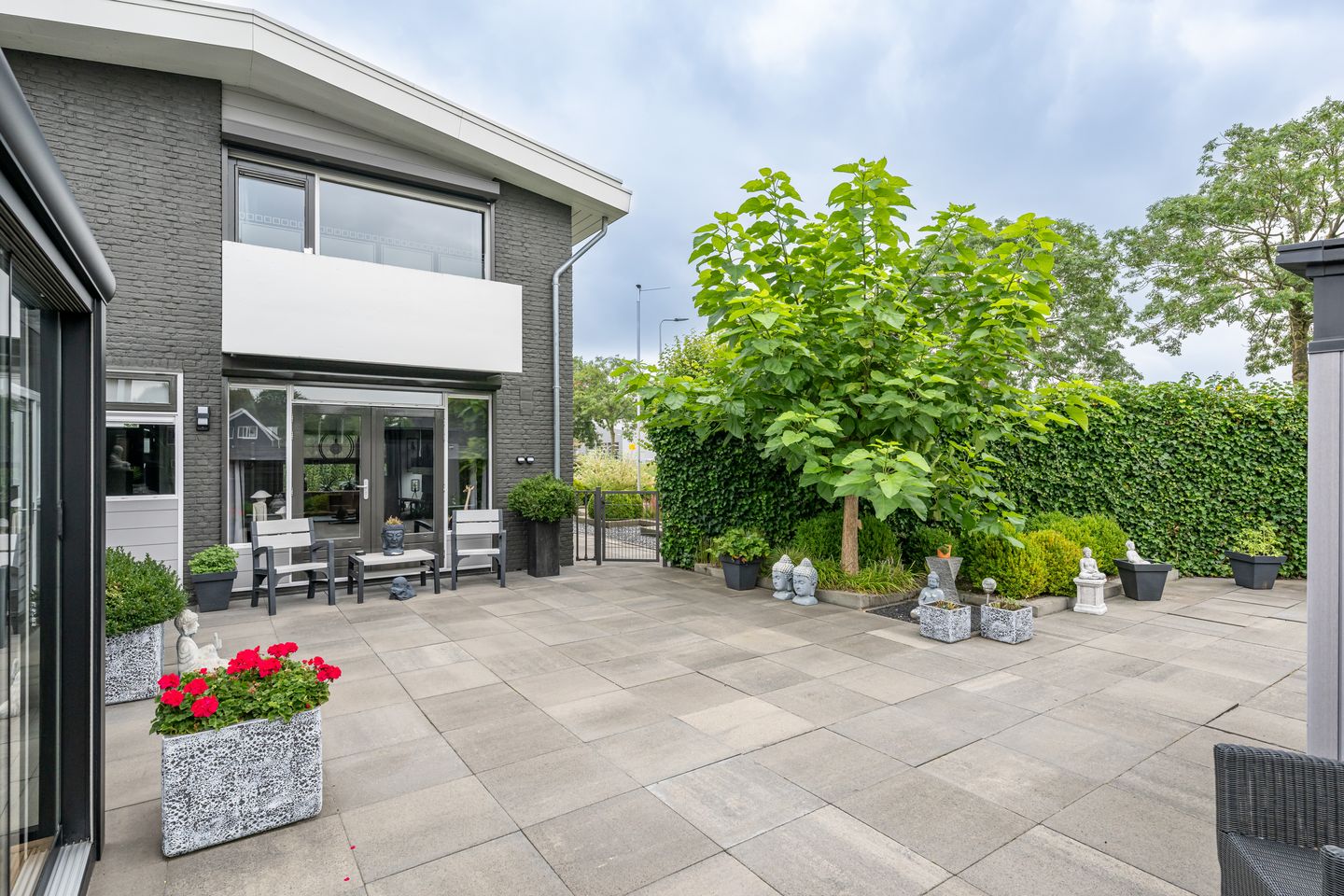 De borders met de vaste planten en de moderne onderhoudsarme bestrating maken het geheel compleet, 220 V, buitenverlichting en buitenkraan.