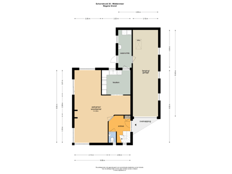 Begane grond: entree, hal met trapopgang en toiletruimte en meterkast, woonkamer, eetkamer, half open keuken in hoekopstelling met diverse inbouwapparatuur, bijkeuken met witgoed-aansluiting, deur naar de tuin en toegang tot de verlengde garage. Vanuit de garage is er een vlizotrap naar een grote bergzolder (stahoogte) met opstelling van de cv-ketel.