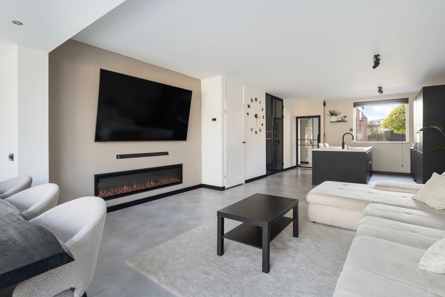 De woonkamer en open keuken vormen één geheel — licht, ruim en praktisch.