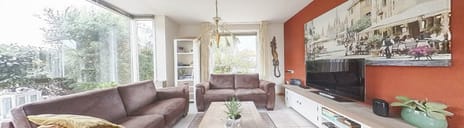 Via de hal, met toilet en handige trapkast, stap je de lichte en sfeervolle woonkamer binnen. Dankzij de vele raampartijen geniet je hier de hele dag van een fijne lichtinval.
