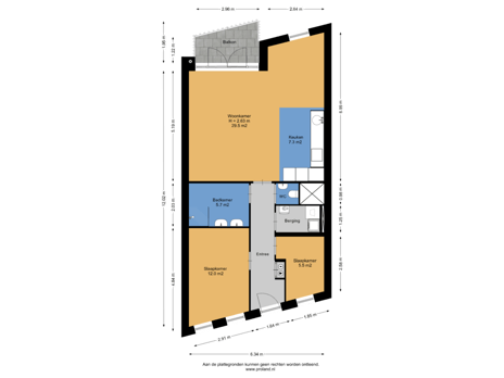 Via de galerij betreed je het praktisch ingedeelde 3-kamer appartement. Het is geheel voorzien van een pvc-vloer met visgraatmotief en vloerverwarming en plafonds en wanden zijn strak gestuukt in neutrale kleurstelling. Vanuit de lange en lichte hal zijn alle vertrekken te bereiken. Direct na de entree ligt links de grootste slaapkamer en rechts de kleinere slaapkamer. Vervolgens bereik je de inpandige berging, met de aansluiting voor wasmachine en droger, met daarnaast de toiletruimte met zwevend toilet en fonteintje. Aan de overzijde ligt de moderne badkamer, die is voorzien van dubbele wastafel, designradiator, badkamermeubel en een inloopdouche.