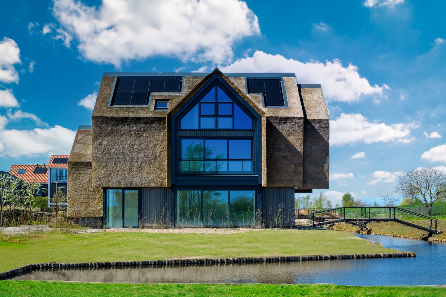 Deze villa combineert hedendaagse architectuur met tijdloze charme dankzij een rietgedekte kap en royale glaspartijen. Natuurlijke materialen – zoals riet en hout – zijn met oog voor detail toegepast, wat de woning een warme, stijlvolle uitstraling geeft. De unieke vormgeving van het dak en de grote raampartijen vallen meteen op en vullen elke ruimte met een overvloed aan daglicht. Tegelijkertijd is deze villa op hoog niveau duurzaam en toekomstbestendig gebouwd: een geavanceerde warmtepomp, balansventilatie en geïntegreerde zonnepanelen zorgen voor een energieprestatie van het hoogste niveau (energielabel A+++). Dit zorgt niet alleen voor een aangenaam binnenklimaat, maar ook voor een energiezuinige leefstijl met bijzonder lage energielasten.