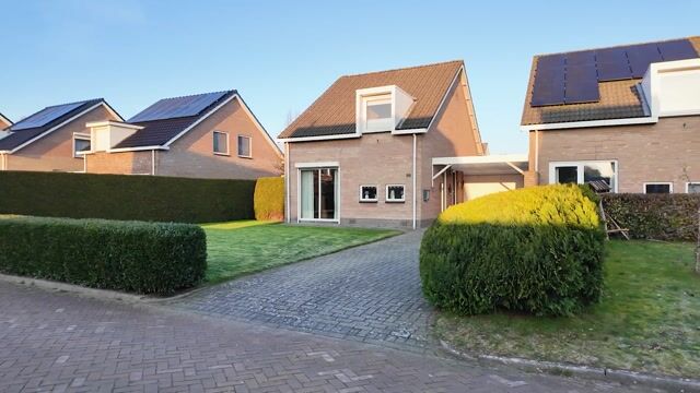De privacybiedende achtertuin is ingericht met bestrating, gazon en enkele borders en vormt een fijne buitenruimte. Het geheel is gelegen op een perceel van circa 389 m².