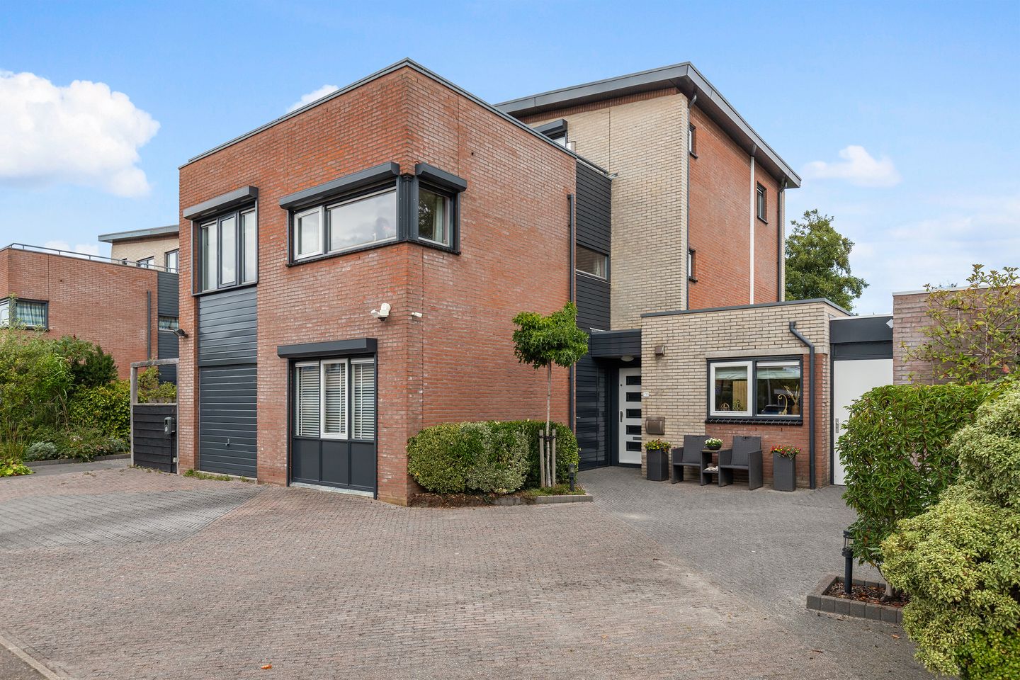 Via de uitstekend aangelegde voortuin met parkeergelegenheid voor meerdere auto’s bereik je de entree van de woning.
