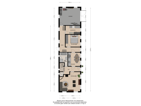 Aan de kopse kant bevindt zich de grote inpandige garage die, indien gewenst, eenvoudig bij de leefruimte betrokken kan worden. Aan de gevel is tevens een houten carport geplaatst.