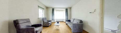• Sfeervolle woonkamer ensuite (ca. 32 m²) met originele schuifdeuren, erker, eiken parketvloer en schuifpui naar de tuin
