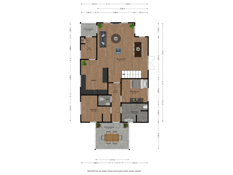 Entree aan de voorzijde, moderne open keuken welke is voorzien van een Quooker, Bora inductiekookplaat met geïntegreerde afzuiging, oven, combimagnetron, vaatwasser en koelkast met aansluitend de sfeervolle woonkamer met vaste open trap naar de eerste verdieping en openslaande tuindeuren naar het terras, hal voorzien van achter entree en lucht warmtepomp voor verwarmen en koelen, modern toilet, royale bijkeuken voorzien van witgoed aansluitingen, bergruimte en ketel opstelling, slaapkamer en luxe badkamer voorzien van vloerverwarming, ligbad, inloopdouche en wasmeubel.