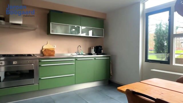 Level 1: The spacious eat-in kitchen features ample storage space, a stainless steel countertop, and various built-in appliances, including a 5-burner gas stove, extractor hood, combination oven, and dishwasher. The kitchen is wonderfully bright thanks to the tall windows. From the kitchen you enter the terrace at the rear of the house with a view of the Zomerpark.