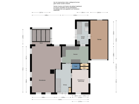 Via de voortuin stap je binnen in de entreehal. Hier bevinden zich de meterkast, de trapopgang naar de 1e verdieping en de betegelde toilet ruimte met fonteintje. Via de entreehal is er toegang tot zowel de achtergelegen keuken, de woonkamer en de slaap-/werkkamer op de begane grond. De werkkamer is voorzien van een water aansluiting en vaste opbergruimte en biedt de mogelijkheid tot levensloopbestendig wonen of het creëren van een werk-/hobbyruimte.