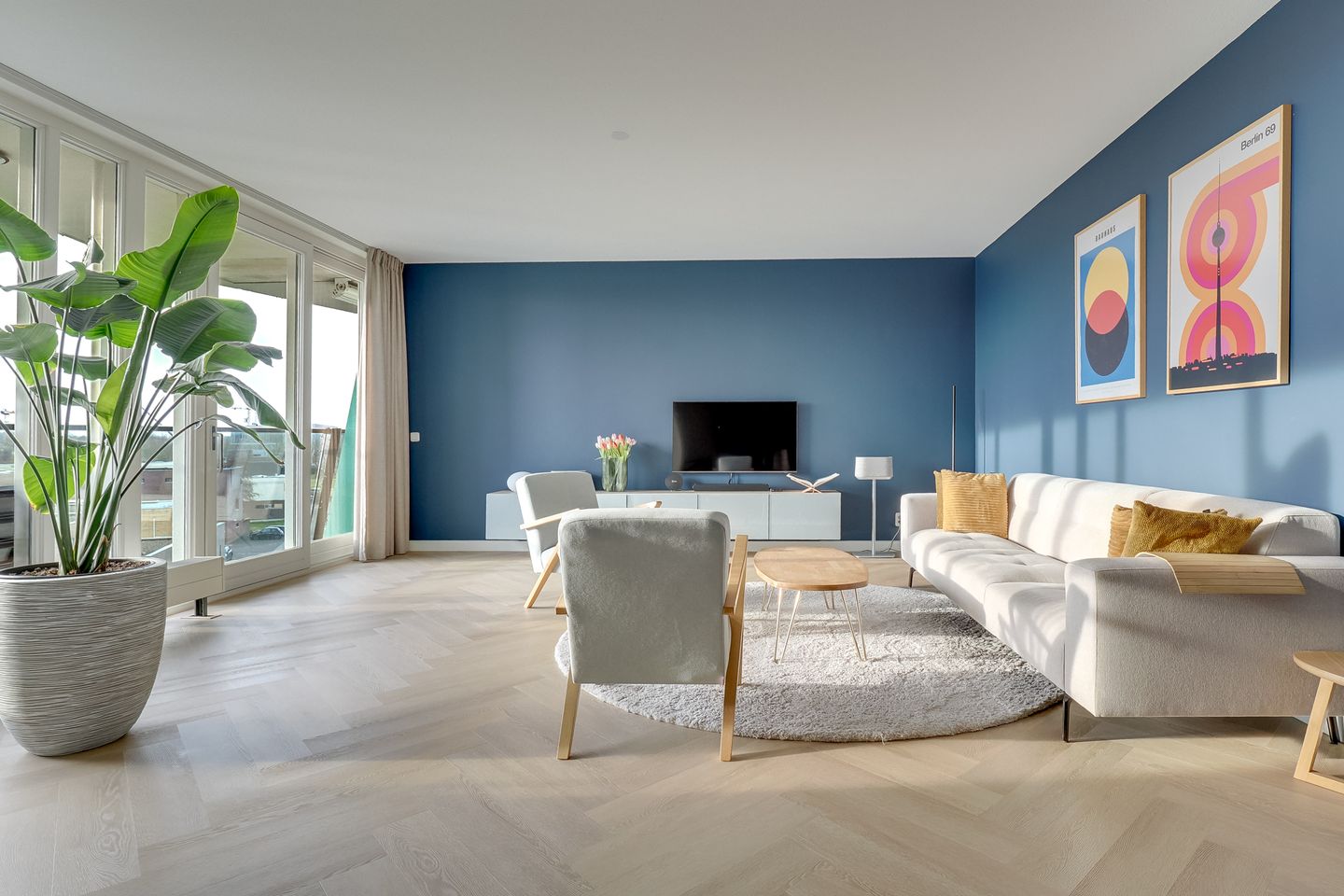 Vanuit de centrale hal bereik je de entree van het luxe afgewerkte appartement. De ruime hal is voorzien van een meterkast, luxe toiletruimte, bergkast met aansluiting stadsverwarming en opstelling wasmachine. De ruime luxe badkamer is ook bereikbaar vanuit de hal en is voorzien van een inloopdouche, wastafelmeubel en een ligbad. Vanuit de hal heb je toegang naar de ruime lichte woonkamer die voorzien is van fraai PVC visgraat parketvloer en stucwerk wanden. De open keuken is voorzien van een luxe witte inrichting in L-opstelling en een eiland. De keuken is voorzien van alle denkbare inbouw apparatuur. De woonkamer, eetkamer en keuken hebben een gezamenlijke oppervlakte van 55,6 m2. Vanuit de woonkamer heb je een schuifpui welke toegang geeft tot het zonnige balkon met een oppervlakte van circa 9,3 m2. Aan de voorzijde van het appartement bevinden zich 2 mooie slaapkamer van respectievelijk 20,6 m2 en 6,9 m2.