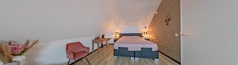 De tweede verdieping is ingericht als luxe masterverdieping en ademt de sfeer van een exclusieve hotelsuite. De slaapkamer met dakkapel beschikt over beamerscherm met ingebouwde beamer, een vrijstaand ligbad, dubbele douche en stijlvol wastafelmeubel. Ook hier is een rolluik aanwezig. Achter het bed en achter de knieschotten is extra bergruimte gerealiseerd. Via de overloop zijn de wasruimte met WTW-installatie en de vliering bovenaan de trap bereikbaar.