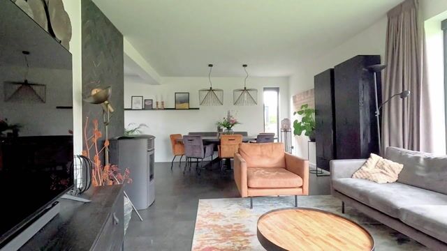 Begane grond: De lichte entree geeft toegang tot de hal met garderobe en het toilet. Via de hal kom je in de moderne open keuken en woonkamer. Aangrenzend bevindt zich een praktische ruimte voor de wasmachine en droger. Vanuit de keuken geven tuindeuren direct toegang tot de achtertuin. De woonkamer is ruim opgezet en biedt dankzij de grote raampartijen volop daglicht. De pellet kachel zorgt voor extra sfeer en warmte.
