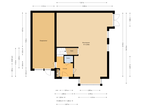 Begane grond: entree, ruime hal met toegang tot toilet, meterkast en trapopgang naar de eerste etage. Ruime woonkamer voorzien van sfeervolle erker en aansluitingen voor de keuken. Aan de achterzijde van de woning is 1 kamer gesitueerd die bijvoorbeeld ingericht kan worden als berging. Het is ook denkbaar om de kamer te gebruiken / in te richten als slaapkamer of kantoor.
