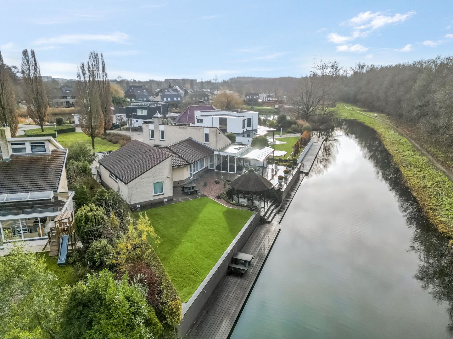 De ligging is zonder twijfel één van de grootste pluspunten. Gelegen aan een heerlijk rustig hofje met nauwelijks verkeer en volop privacy, woon je hier in alle rust. Aan de achterzijde opent zich een compleet andere wereld: een brede, fraai aangelegde tuin direct aan het water. Meerdere terrassen, een lange vlonder en een sfeervol prieeltje maken dit een plek waar het buitenleven een hoofdrol speelt.