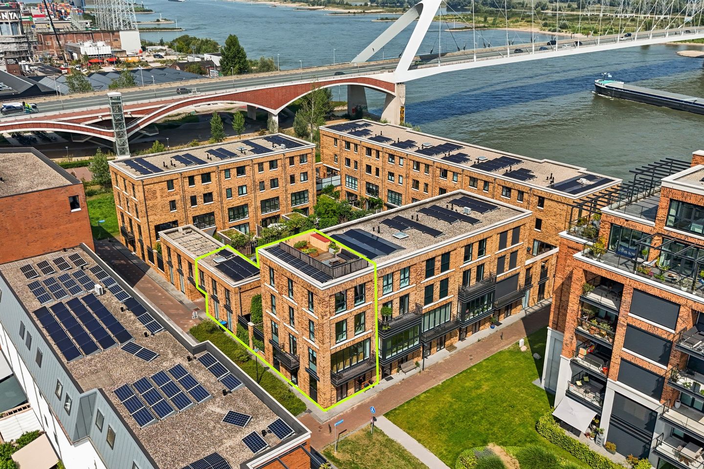 Aan de voorzijde ligt het grootste balkon op het zuidoosten. Hier vouw je de harmonica-deuren over de volle breedte open en kijk je vrij uit over de wijk en het veld, met links een doorkijk naar de Waal. Aan de zijkant is een tweede balkon op het zuiden met zicht op de straat.