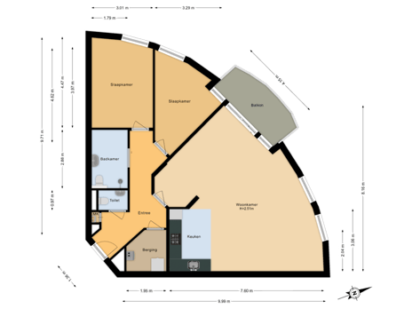 Indeling appartement: entree, ruime hal met videofoon installatie, vrijdragend toilet met fontein, ruime berging met cv-combiketel, aansluitingen voor de wasapparatuur en garderobe. Royale woonkamer met schuifpui naar het zonnige balkon met weids uitzicht. Half open keuken met L-vormige keukenopstelling voorzien van koel- vriescombinatie, 4 pits gaskookplaat, afzuigschouw, oven, vaatwasser, etc. Het appartement beschikt over 2 slaapkamers. De badkamer is voorzien van een inloopdouche, wastafel en 2e toilet.