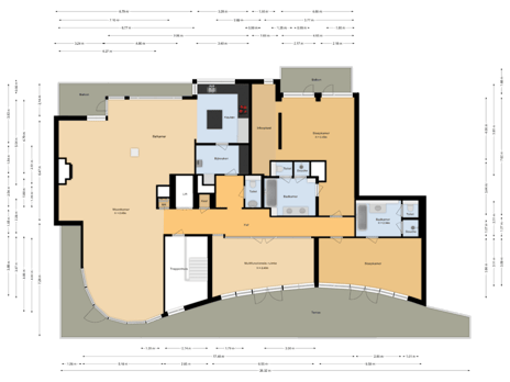 Entree, videofoon installatie, ruime hal, aparte garderobe, toiletruimte voorzien van vrijdragend toilet en fontein. Dubbele openslaande deuren naar royale living van ca. 90 m2 met (gas) openhaard (2025), Belgisch hardstenen schouw omgeven met maatwerk boekenkasten. Toegang naar zonnige terrassen aan zowel land- als zeezijde met natuurstenen vloeren en glazen balkonafscheiding. Vernieuwde half open keuken voorzien van diverse inbouwapparatuur, o.a. afwasmachine, 5 pits inductie kookplaat, afzuigkap, combi-oven, heteluchtoven (allen Miele), Liebherr dubbeldeurs koel- vriescombinatie, Quooker, servieskast, etc. Aparte bijkeuken met Belgisch hardstenen vloer, aansluitingen voor de wasapparatuur en keukenblok, bergruimte en cv installatie (2021).