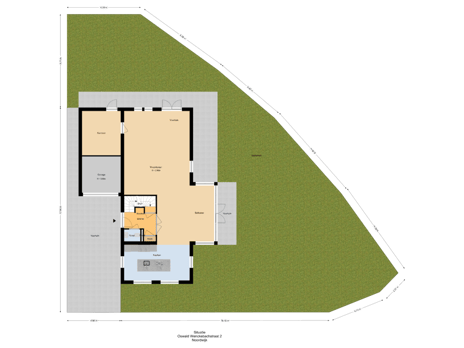 Via de eigen oprit met plaats voor 2 auto's en doorgang naar de bergruimte/garage bereikt u de fraaie entree van de woning. Bij binnenkomst betreedt u de hal met ruim trappenhuis. Dubbele deuren geven toegang tot de woonkamer, terwijl een aparte deur leidt naar de ruime kelder, ideaal als wijnkelder of voor extra opslag. In de hal bevinden zich tevens de meterkast en een stijlvol afgewerkt toilet met wandcloset en fontein. De ruimte is voorzien van een praktische inloopmat en een moderne gietvloer met comfortabele vloerverwarming.