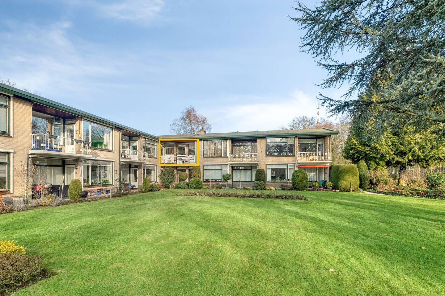 Het appartement beschikt over een balkon op het zuidwesten met vrij uitzicht over het gazon en de verzorgde tuin van het complex. De gezamenlijke buitenruimte is keurig onderhouden en draagt bij aan het rustige karakter van het geheel.