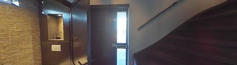 Covered entrance, hallway with staircase, practical under-stair storage cupboard and meter cupboard. Modern toilet with wall-mounted toilet and washbasin.