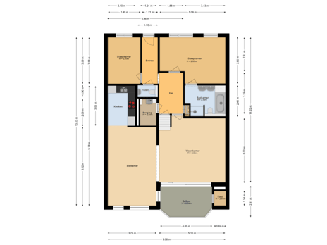 Vanaf de hal die grenst aan de liftingang en trapopgang, loopt u de galerij op. Hier is de entree van het appartement bereikbaar. De hal van het appartement biedt toegang tot de separate toiletruimte, 2 slaapkamers, badkamer, inpandige berging met wasmachine aansluitingen, meterkast, trapopgang en de woonkamer.
