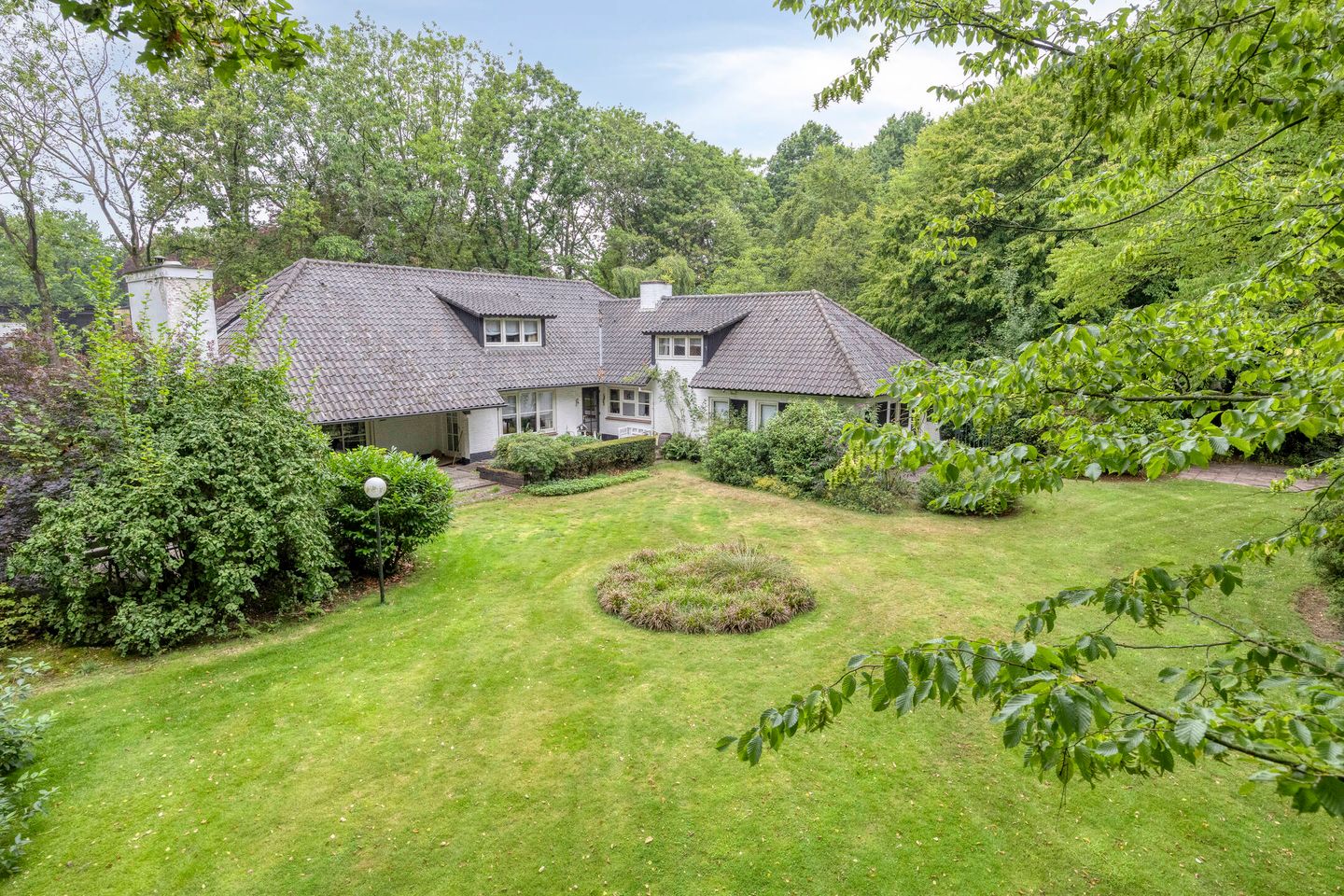 Deze jaren ’70 villa wordt omringd door een royale, parkachtige tuin die optimale privacy biedt. Hoge bomen, brede borders en een gazon bepalen de sfeer, en het deels overdekt terras met buitenhaard is de perfecte plek om buiten te zitten. Loop rond geniet van al het moois, van rondfladderende vlinders tot fluitende vogels in de bomen…