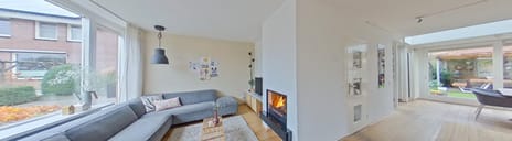De woonkamer, met vrij uitzicht over de straat, is dé plek om te ontspannen. De haard, het strakke plafond en de sfeervolle parketvloer zorgen samen voor een warme, uitnodigende sfeer waar je zó op de bank ploft.