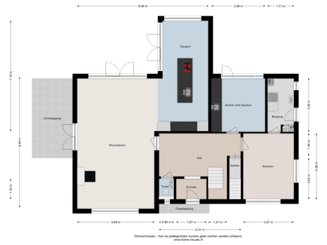 Begane grond: Entree/hal met voorportaal, royale hal, toilet en toegang naar de verdieping, kelder, woonkamer, kamer met keuken en kantoor beneden. De ruime woonkamer is voorzien van een sfeervolle en duurzame Jacobushaard, openslaande tuindeuren naar het terras en geeft toegang tot de open keuken.