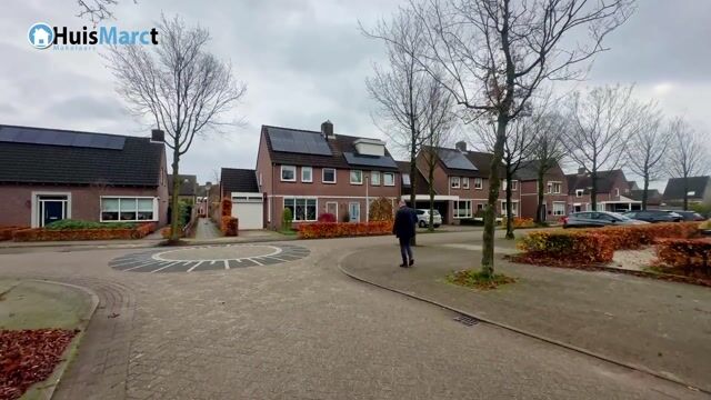 Kijkend naar de voorzijde van het huis zien we dat de gevel optisch is opgedeeld in 2 vlakken door een lijn van betonnen elementen, wat een leuk effect geeft. We zien ook dat het huis op diverse punten van een update is voorzien. Zo zien we kunststof kozijnen, ook de voordeur is vervangen door een kunststof exemplaar. Op het dak liggen zonnepanelen en zo te zien is de garage naar de voorzijde vergoot. De voortuin ziet er onderhoudsarm en verzorgd uit.