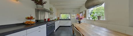 Aan de achterzijde ligt de sfeervolle woonkeuken met haard, een heerlijke plek om samen te koken en te tafelen. Vanuit de woonkeuken is direct toegang tot de prachtige tuin.