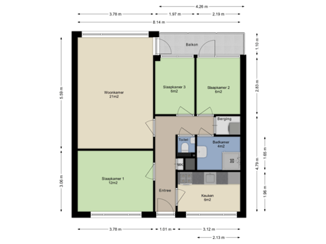 - Slaapkamer 3 van ca. 6m² eveneens aan de achterzijde van het appartement gelegen.
