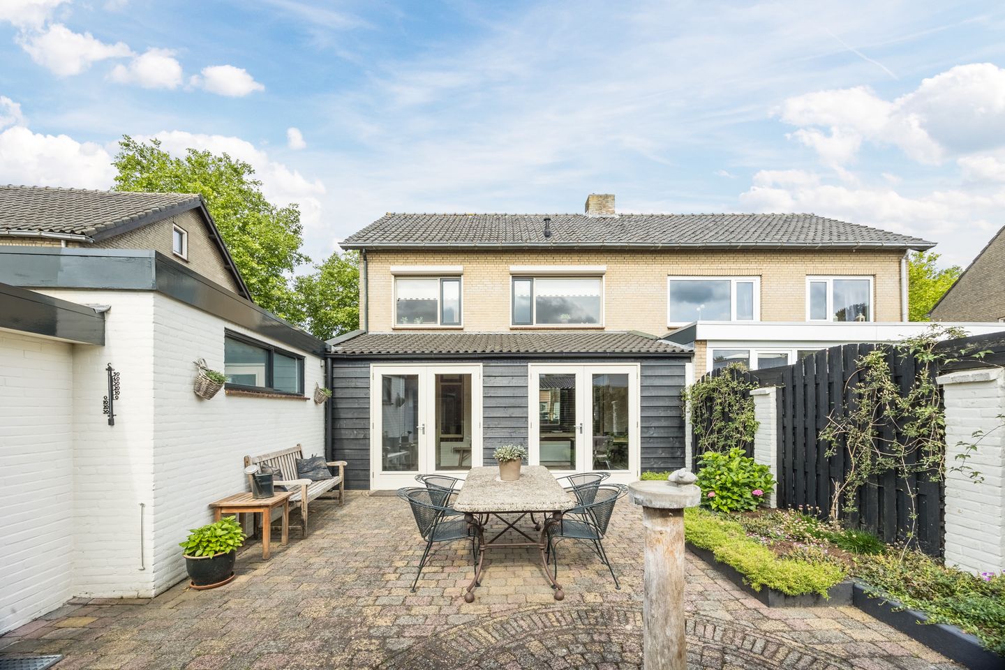 De woning heeft zowel aan de voor- als achterzijde een ruime tuin. De achtertuin biedt veel privacy door het ontbreken van directe achterburen. Het sier bestrate terras is gelegen direct achter de woning en strekt zich uit over de gehele tuin die daarmee heerlijk onderhoudsarm te noemen is. Ook is hier de toegang tot een tweetal ruime bergingen welke momenteel ingericht zijn met vollieres.