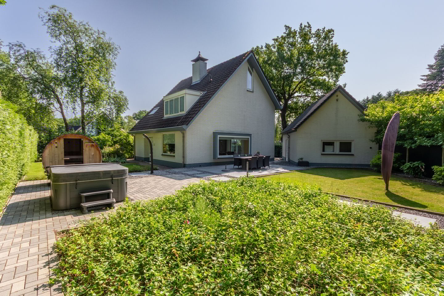 De tuin rondom de woning is met zorg aangelegd en vormt een heerlijke plek om buiten te leven en te ontspannen. Je vindt hier een prettige afwisseling van siergrind, bestrating, een verzorgd gazon, groene hagen en borders met gevarieerde beplanting, wat zorgt voor een sfeervolle en rustige uitstraling. Er zijn meerdere terrassen aangelegd, ideaal voor het plaatsen van grote buitentafels waar je met familie en vrienden kunt genieten van lange zomerdagen. Daarnaast is er een gezellige veranda met een comfortabele loungeset, waar je het hele jaar door kunt genieten van het buitenleven. Als kers op de taart beschikt deze tuin over luxe wellnessvoorzieningen: een sauna, een jacuzzi en een buitendouche. Perfect om te ontspannen na een lange werkdag of om jezelf een vakantiegevoel in eigen tuin te geven!
