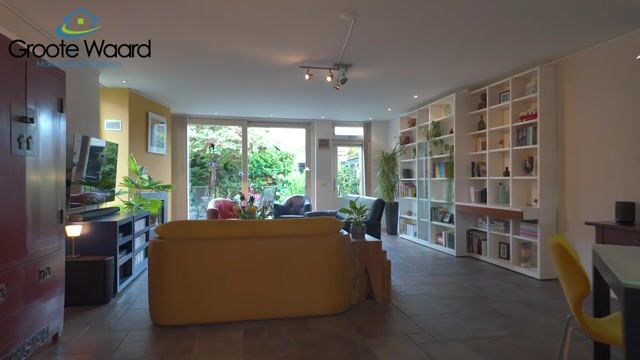 Aan de achterzijde zorgen de brede schuifpui en loopdeur voor een vloeiende overgang naar de zonnige achtertuin op het zuiden. De strakke wandafwerking, sfeervolle gashaard, plafond met inbouwspots en het verzorgde afwerkingsniveau creëren een warme en uitnodigende sfeer.