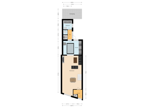 Via de voordeur bereikt u de entree van deze woning. Hier bevindt zich de meterkast (inclusief glasvezelaansluiting) en heeft u de toegang naar de woonkamer. De woonkamer (± 35 m²) is ruim opgezet waardoor u direct een prettige binnenkomst heeft. In de woonkamer zijn diverse eet- en zithoeken te creëren. Vanuit de woonkamer bereikt u de semi-open keuken en via de trapopgang bereikt u de eerste verdieping. De gehele voorzijde is voorzien van kunststof kozijnen met HR++ beglazing. De semi-open keuken (± 12 m²) is met de aanwezigheid van de lichtkoepel een fijne lichte ruimte waar u de lekkerste gerechten kunt bereiden. De keuken is eenvoudig ingericht en is nog volledig naar wens te maken. De aansluitingen ten behoeve van het witgoed bevinden zich eveneens in de keuken. Vanuit de keuken is er de toegang naar het tussenportaal waar vanuit de het toilet, de stookruimte, de badkamer en de achtertuin toegankelijk zijn. In de stookruimte is de cv-ketel opgesteld (Vaillant, 2021, huurketel). De badkamer (± 4 m²) is eenvoudig, maar functioneel ingericht met een ligbad en een wastafel.