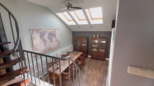 - Skylight, flue, sliding door, TV via cable, and solar panels