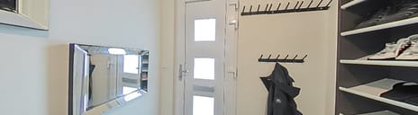 De voordeur bevindt zich aan de zijgevel van de woning en geeft toegang tot een lichte entreehal. Hier vindt u een vaste kast met de opstelplaats voor de cv-combiketel en de unit voor de vloerverwarming, die met zes groepen de volledige begane grond (m.u.v. de slaapkamer) verwarmt via moderne plavuizen.