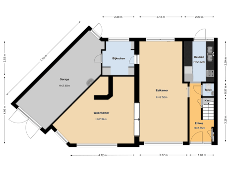 Vanuit de woonkamer bereikt u de bijkeuken en aansluitend de inpandige garage. Deze is voorzien van elektra, verwarming, water en elektrische openslaande deuren. Er is ruimte voor een auto en een extra deur geeft toegang tot de achtertuin.