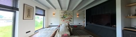 De living is uitnodigend en ruim, met hoge plafonds en zichtbare balken die het karakter van de boerderij benadrukken. Overal vind je subtiele details: houten vloeren, ambachtelijke afwerkingen en zichtlijnen naar het groen.