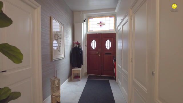Via de statige entree betreed je de ruime hal met marmeren vloer, meterkast (vernieuwd) en een grote garderobekast. Vanuit hier is er toegang tot de sfeervolle woon- en eetkamer en suite. De woonkamer ademt karakter door de originele glas-in-lood bovenlichten, en suite-schuifdeuren, paneeldeuren, sierlijsten en een schouw met sfeerhaard. In zowel de woon- als eetkamer ligt een fraaie eiken visgraatparketvloer.