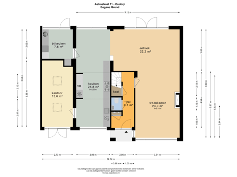 Aan de voorzijde van de woning bevindt zich een ruime thuiswerk-/kantoorruimte (ca. 15,5 m²), bereikbaar via de hal en voorzien van dubbele deuren naar de voortuin – ideaal voor werk of praktijk aan huis.